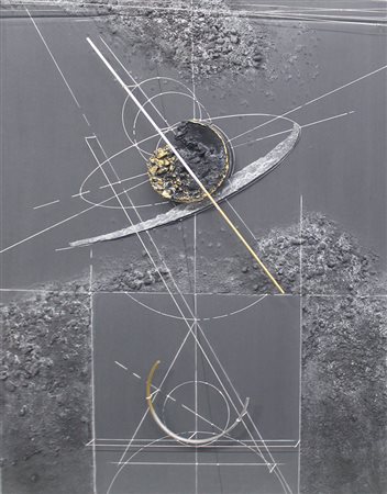 Lotto 16 WALTER VALENTINI, "Le misure, il cielo", 1998, Tecnica mista su tavola, Dim. 125x100, Al verso: misure e N° di archiviazione 99398 in alto a destra e a sinistra, in basso etichetta dell'artista e etichetta Palazzo Magnani mostra "Walter Valentini sullle tracce dell'infinito" 27/10-30/12/2001, Opera accompagnata da autentica. Opera protetta da teca in plexiglass