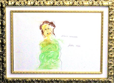 Lotto 18 TANO FESTA, "Dama Romana", 1986, Tecnica mista su cartoncino intelato, Dim. 50x70, Al fronte: titolo, firma e data al centro dell'opera. Opera archiviata dall'archivio Raffaella Soligo al N°RM586570701021. Opera con cornice.