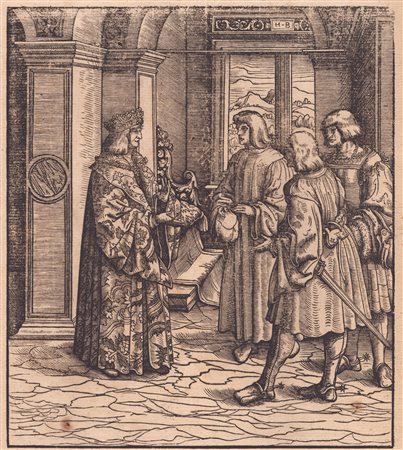 xilografia, 33 x 23,5 cm, edizione di Der Weisskunig del 1775, stampata su carta vergata, foglio in buone condizioni salvo lievi bruniture, incollato lungo il margine superiore su passe-partout moderno. Bartsch 80 -