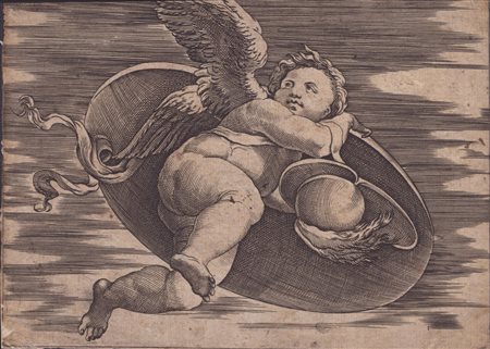 da un dettaglio dell'affresco di Raffaello nella Villa Farnesina. Bulino, 121 x 165 mm. Bartsch XIV.179.218. Bellissima impressione su carta vergata con filigrana. Esemplare rifilato, in buono stato di conservazione salvo restauri lungo il bordo sinistro. -