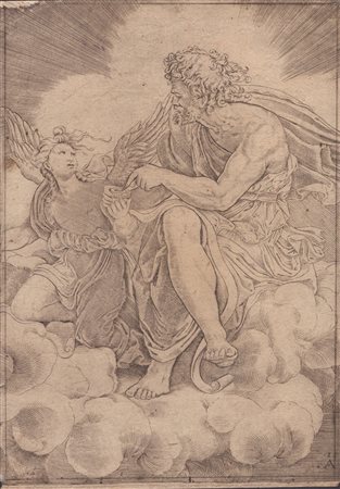 bulino, 60 x 80 mm. Robert-Dumesnil IX.61.197. Impressa su carta vergata, esemplare rifilato all'interno del soggetto, mancante gli angoli che inquadrano l'ovale con le iscrizioni. -