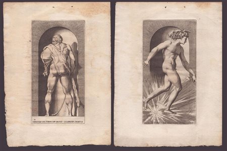 Lotto di due incisioni. Acquaforte, 111 x 44 mm cad. Bartsch XX.101.8 e 9. La prima è una bella impressione su carta vergata con un frammento di filigrana. Esemplare rifilato, con piccolo margine inferiore e superiore. Una macchia da colla in alto a sinistra. La seconda stampata su carta vergata sottile. Carta leggermente brunita, con un mancanza all'angolo inferiore destro e qualche macchia. In generale in buono stato di conservazione. -