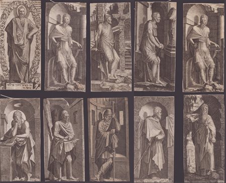 lotto di 10 incisioni della serie di 14 raffiguranti Cristo con gli apostoli e San Paolo. Bulino, 197 x 97 mm ca. cad. Hollstein 9-22. Passavant III.111.5-17. II e III stati. Bellissime e nitide impressioni su carta vergata sottile. Esemplari rifilati ma per il resto in ottimo stato di conservazione. -