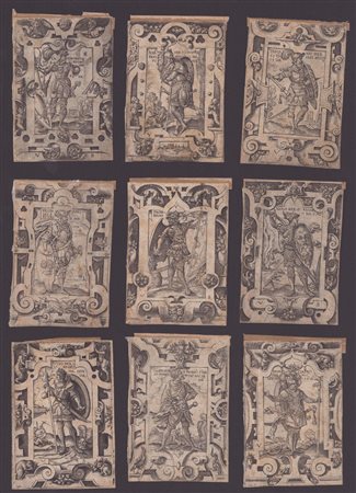 Lotto di 9 tavole della serie di 12. Bulino e acquaforte, 82 x 52 mm ca. cad. Hollstein 298-309; O'Dell-Franke 19-30; Bartsch IX.254.72-83