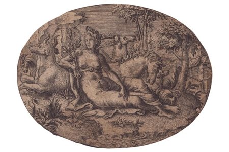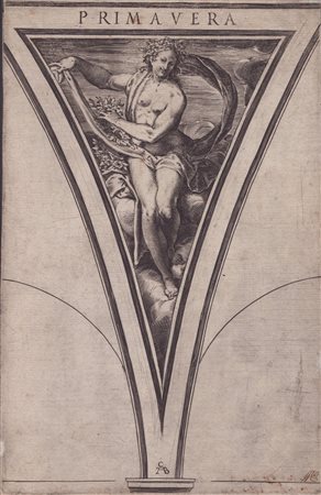 da Giulio Romano. Bulino, 210 x 147 mm. Bartsch XIV.83.95 II stato. Esemplare non completo, con mancanti circa 1 cm da ogni lato (e una parte di inscrizione in basso a destra). Stampata su carat vergata. Tre angoli restaurati. -