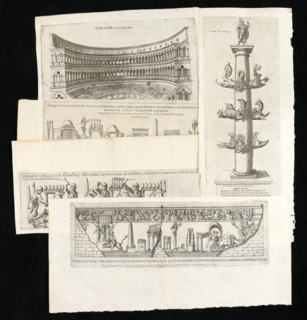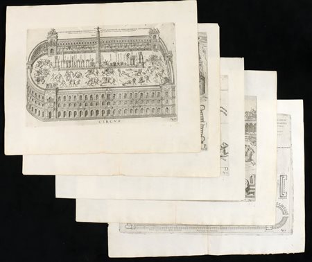 Lotto di 5 tavole raffiguranti i circhi di antica Roma. Bulino e acquaforte, 395 x 505 mm ca. (foglio). Tavole tratte da "Onuphrii Panvinii Veronensis, De ludis circensibus, libri II". Bellissime, fresche e ben inchiostrate impressioni su carta vergata sottile (alcuni con filigrana). Consuete pieghe editoriali. Fogli in ottimo stato.