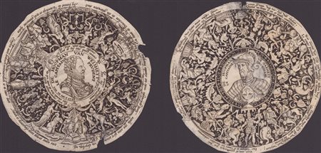 lotto di due incisioni di una serie di quattro disegni per piatti riccamente decorati. Bulino, diam. 12,2 mm e 12,4 mm. Hollstein 178 e 179. Belle impressioni su carta vergata sottile. Esemplari rifilat. In generale in buono stato ma con qualche strappo, mancanze e foro. -