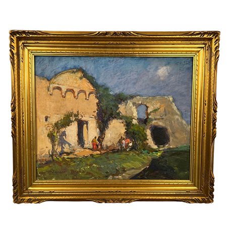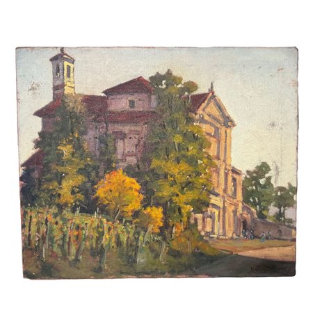 Lotto 19 Dipinto olio su tela, periodo XX secolo, scuola Italiana raffigurante Chiesa con paesaggio.