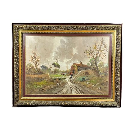 Lotto 4 Dipinto olio su tela, periodo XX secolo scuola Italiana raffigurante Strada con alberi e carrozza.