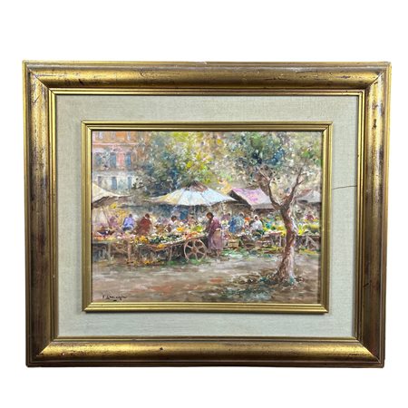 Lotto 20 Dipinto olio su cartoncino, periodo XX secolo, raffigurante Scena di mercatino.