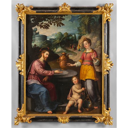 Lotto 0023 Scuola toscana sec.XVII 'Cristo e la Samaritana al pozzo' olio cornice coeva in legno laccato intagliato e dorato (nel retro antica ceralacca di collezione)