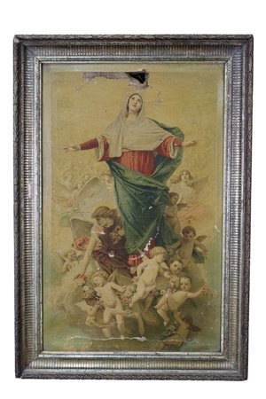 Lotto 17 STAMPA TELATA raffigurante Madonna con angeli dentro bella cornice in legno e pastiglia dorata Sicilia XX secolo h cm 95 x 65