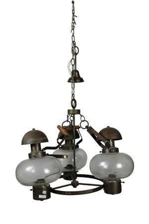Lotto 18 LAMPADARIO DI GUSTO NAVALE composto da tre lanterne in metallo e vetro manifattura siciliana primi 900 h cm 100 x 65