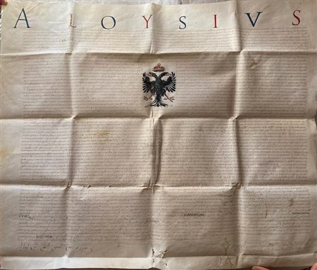 Foglio unico, mm. 650 x 780 circa, mm. 30 inferiore ripiegato, testo di 70 righe, la prima scritta in maiuscolo alternativamente blu o rosso, il resto scritto in corsivo semicorsivo con poche parole e nomi in caratteri più grandi, alcuni anche in capitelli, incorporanti l'impresa imperiale dipinta del Sacro Romano Imperatore, un'aquila bicipite allargata, e una corona, con le consuete pieghe orizzontali e verticali, e alcuni piccoli fori.
