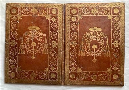Lotto 14 la prima del secolo XVIII in pelle marrone con stemma vescovile, interamente decorata in oro; la seconda appartiene alla prima metà del XVIII sec. in pelle marrone scura con un grande stemma cardinalizio impresso e con dorso ornato.