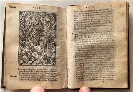 In 16° (foglio 103 x 72 mm), legatura seicentesca in vitello marrone, qualche macchia di umidità al margine interno o esterno negli ultimi fascicoli, per il resto buon esemplare. Stampato in caratteri romani molto piccoli, con iniziali e titoli xilografici all'inizio di ogni capitolo, e graziosamente illustrato con 21 xilografie a ¾ di pagina nell'ultima sezione, dedicata all'Apocalisse di San Giovanni.; ss. 143, (17).