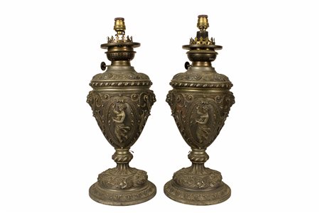 Lotto 5 COPPIA DI LUMI in metallo riccamente sbalzato a basso rilievo e brunito di gusto rinascimentale Sicilia 1880-1910 circa h cm 40 x Ø 15
