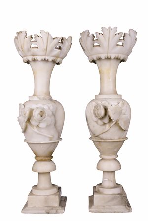 Lotto 9 COPPIA DI VASI in alabastro scolpito e tornito, rotture e mancanze Francia seconda meta XIX secolo h cm 45 x 15