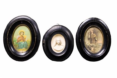 Lotto 19 LOTTO COMPOSTO DA sei cornicette contenenti tre raffigurazioni sacre in schiuma due stampe sacre e una miniatura raffigurante madonna con bambino usure e mancanze Italia XIX secolo misure varie