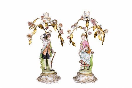 Lotto 24 COPPIA CANDELABRI in porcellana dipinta e lumeggiature in oro raffigurante nobil uomo e nobil donna con tralci in metallo dorato e fiori in porcellana manifattura Capodimonte prima metà del XX secolo h cm 40 x 16
