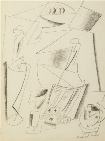 Lotto 14 SEVERINI GINO (1883 - 1966) NATURA MORTA CON CARTE DA GIOCO E OROLOGIO SVEGLIA, 1965. Matita su carta. Cm 30,00 x 40,00. firma e data