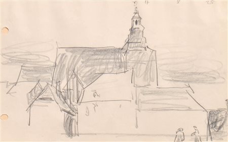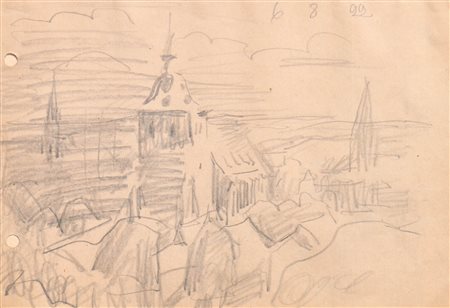 Lotto 1 Lyonel Feininger (New York 1871 - 1956) Paese con campanile, 1922;Matita su carta con due fori al lato sinistro, 14 x 21 cm, al retro