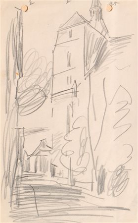 Lotto 3 Lyonel Feininger (New York 1871 - 1956) Vicolo di paese con campanile, 1925;Matita su carta con due fori al lato sinistro, 22 x 13,8 cm, al retro iscrizione