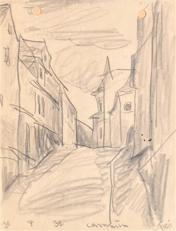 Lotto 4 Lyonel Feininger (New York 1871 - 1956) Vicolo di paese con edifici, 1932;Matita su carta con due fori al lato sinistro, 17,7 x 14,4 cm, al retro iscrizione