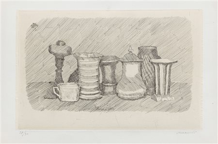 Tiratura postuma su carta Giappone numerata e firmata dalle sorelle dell'artista comprendente 6 prove di stampa, 3 esemplari segnati a, b, c, 10 esemplari segnati da I/X a X/X e 120 esemplari numerati da 1/120 a 120/120 destinati al volume 50 acquarelli di Giorgio Morandi, edito a Torino nel 1973. -