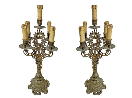 Lotto 12 Candelabri da tavolo a cinque luci in ottone dorato, 19° secolo h cm 55x27