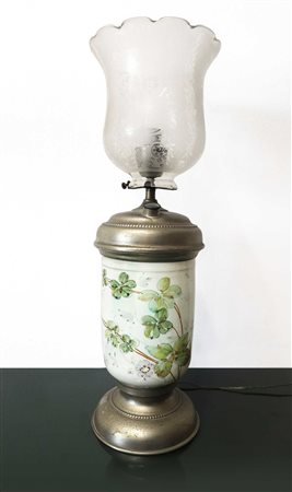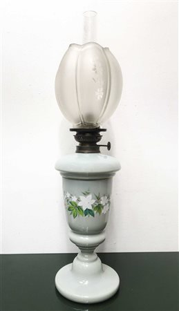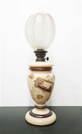 Lotto 17 Lume a petrolio in opalina beige, 19° secolo h cm 55 Base in opalina beige. Dipinto a mano con soggetti floreali, diffusore in vetro con motivi florealiBase in opalina beige. Dipinto a mano con soggetti floreali, diffusore in vetro con motivi floreali