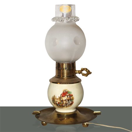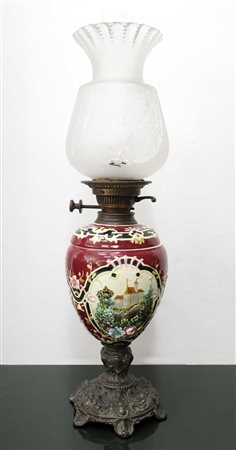 Lotto 16 Lume a petrolio in porcellana dipinta con paesaggi, 20° secolo H cm 65 Base in metallo patinato bronzo, coppa in vetro bulinato.Base in metallo patinato bronzo, coppa in vetro bulinato.