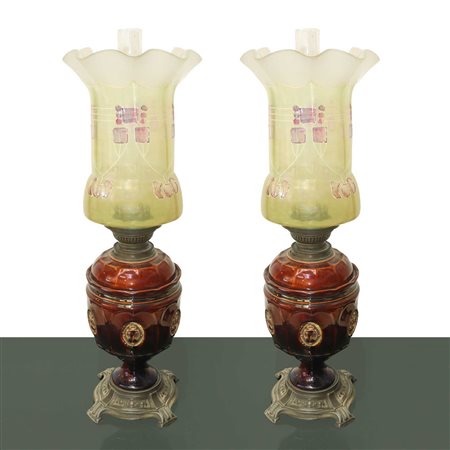 Lotto 19 Coppia di lumi a petrolio, con decorazioni periodo liberty H cm 57 Con base in peltro, contenitore in ceramica e diffusore in vetro smaltato. Con base in peltro, contenitore in ceramica e diffusore in vetro smaltato.