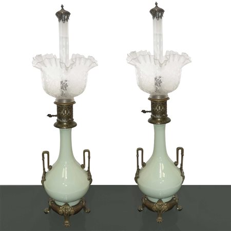 Lotto 20 Coppia di lumi ad olio in porcellana Celadon, 19° secolo H cm 77 Con base in metallo e diffusore in vetro soffiato a merletto bulinato a motivi floreali. Manici ai lati in metallo doratoCon base in metallo e diffusore in vetro soffiato a merletto bulinato a motivi floreali. Manici ai lati in metallo dorato