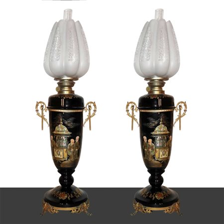 Lotto 14 Coppia di lumi e petrolio, Vecchia Francia, Napoleone III, 19° secolo H cm 68, base cm 22 Dipinti a mano sul fronte e sul retro. Base in bronzoDipinti a mano sul fronte e sul retro. Base in bronzo
