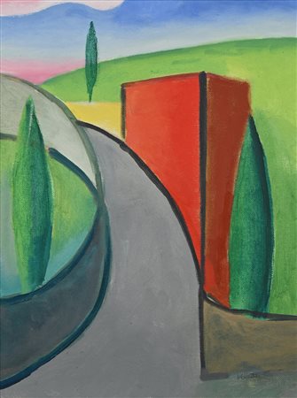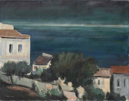 Paesaggio Anni '70 olio su tavola cm 28.5x38 - in cornice cm 52x61 Firma e monogramma in basso a destra "Pietro Annigoni". Al verso reca etichetta della Galleria Lo Zodiaco, Livorno