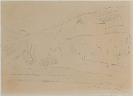 Paesaggio 1943 Matita su carta cm 19,2x26,5 - in cornice cm 31x40 Firma e data in basso a destra "Morandi 1943" E. Tavoni, Morandi, Disegni Catalogo Generale, Electa Milano 1994, pag. 80 n. 1943-20 Certificato di autenticità su fotografia firmato dalla Prof.ssa Marilena Pasquali