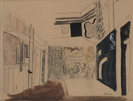 Interno con decorazioni 1936 circa Matita, matita grassa, tempera e tempera diluita su carta applicata su cartone cm 30x39,6 Firma apocrifa "Sironi" in basso a destra Autentica rilasciata dall'Associazione per il Patrocinio e la Promozione della Figura e dell'Opera di Mario Sironi -