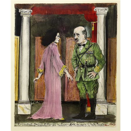 Lotto 1 Bruno Caruso (Palermo 1927-Roma 2018) - Gabriele D’Annunzio e Eleonora Duse H cm 39x31,5 Tecnica mista su cartoncino applicato su tavola Firmato in basso a destra. In cornice, ottime condizioni. Provenienza collezione Dott. Luigi Profenna, grande collezionista e conoscitore d’arte. Verbale di autenticazione e numero di repertorio N. 284209 Cambi – Milano. L'opera riporta in basso una scritta autografa di Caruso di valore storico "Il comandante Gabriele d'Annunzio ed Eleonora Duse nel corridoio del Teatro Biondo (di Palermo) si incontrano casualmente nel marzo del 1920...". D'Annunzio e la Duse erano stati amanti.