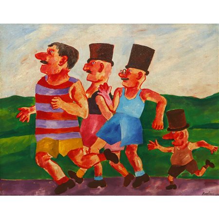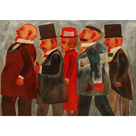 Lotto 2 Franz Borghese - Personaggi in fila H cm 50,5x70x5 - in cornice H cm 74x93 Olio su tela Firmato al fronte in basso a destra. Firmato a penna al retro a sinistra.