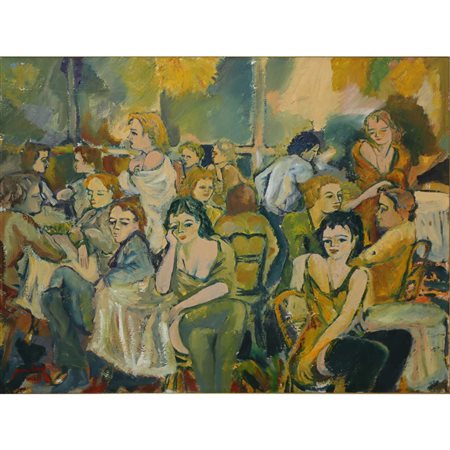 Lotto 5 Stefano Puleo (Acitrezza 1950) - Interno di bar con personaggi, 1988 cm 40X50, in cornice cm 55X65 olio su tela Firmato in basso a sinistra e sul retro datato 1988.