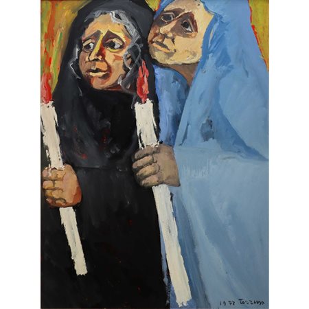 Lotto 10 Saverio Terruso (Monreale 11/01/1939-Milano 03/03/2003) - Particolare di processione a Monreale, 1972 H cm 80x50 Olio su tavola Firma e anno in basso a destra, firma titolo e dedica ad personam al retro. Timbro della Biblioteca Civica Città di Loano al retro. In cornice, dipinto in buone condizioni di conservazionei. Provenienza collezione privata. Presente il Certificato di Garanzia e Autenticità della Casa d'Aste Meeting Art.