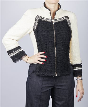 Lotto 17 CHANEL Giacca . . . Giacca con chiusura a zip, bottoni gioiello con logo Chanel e pizzi e merletti a decoro dei polsini, collo e altre finiture. Il taglio della giacca, sul fondo, è in pò irregolare. Internamente è foderata e con spalline. Color panna e nero. Taglia 40: lunghezza 57 cm; vita 41 cm; composizione 90% cotone; 10% nylon