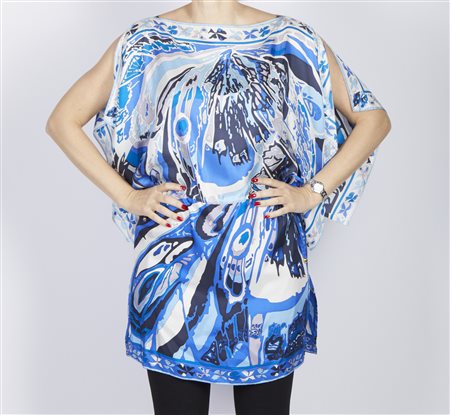 Lotto 21 PUCCI Maglia copricostume. Seta. . Copricostume nei toni del blu, azzurro e nero. Elastico in vita regolabile con laccetti. Etichetta con logo. Taglia 42 I; 38 F; 8 USA: lunghezza 84cm; spalle 40 cm; vita 48 cm; Composizione 100% seta