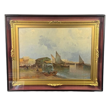 Lotto 22 Dipinto olio su tavola, periodo XX secolo scuola Italiana, raffigurante Scorcio di marina. Dimensioni interno cornice: 31x24 cm. Dimensioni compreso cornice: 46x41 cm. Reca firma in basso a destra di difficile lettura. Opera di straordinaria qualità artistica.