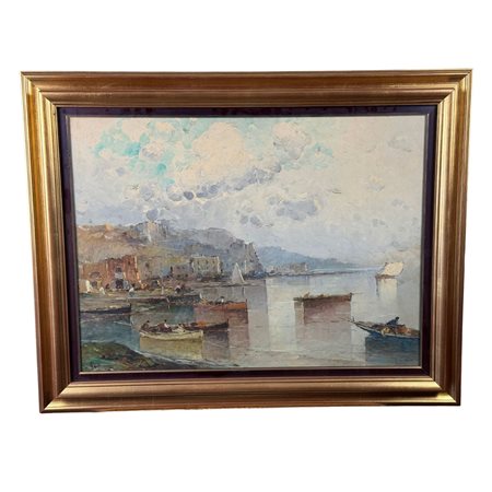 Lotto 17 Dipinto olio su tavola, periodo inizio XX secolo scuola Napoletana, raffigurante Golfo di Napoli.