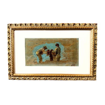 Lotto 21 Dipinto olio su tavola, periodo XIX secolo, scuola Italiana raffigurante Pescatori. Dimensioni interno cornice: 20x11 cm. Dimensioni compreso cornice: 31,5x20 cm. Reca firma in basso a destra da Antonino Leto 1844 - 1913. Opera in buone condizioni.