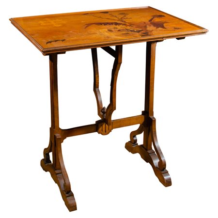 Tavolino a due ripiani decorato a marqueterie in legni vari, con scena di paesaggio sul piano superiore e floreale su quello inferiore, 1900 circa; firmato sul piano a marqueterie: Gallé