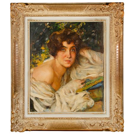 L’opera proviene dalla collezione di Arturo Benvenuti (Oderzo 1923 - 2020), poeta, pittore, fotografo, e intellettuale che per primo celebrò la figura di Alberto Martini, suo conterraneo. A lui si deve la nascita a Oderzo della Pinacoteca dedicata al grande artista, inaugurata nel 1970, che ancora oggi, a più di mezzo secolo di distanza, rappresenta il luogo principale per poter ammirare gran parte della sua opera. L’ideazione della Pinacoteca civica prese il via dalla donazione, da parte di Maria Petringa (vedova di Martini) al Comune di Oderzo dell’Autoritratto del marito (eseguito nel 1911), in occasione della sua mostra antologica del settembre 1967. Tale manifestazione fu promossa e organizzata dallo stesso Benvenuti, che la concepì quale primo vero tributo post mortem all’artista, sublimato dall’intervento nel catalogo della mostra di Giuseppe Marchiori. Dopo questo primo lascito si aggiunsero di lì a poco altre ottanta opere (donate sempre dalla vedova), che resero possibile, nel 1970, la costituzione della Pinacoteca (che cambiò sede da quella iniziale di Cà Diedo a quella della Biblioteca civica nel 1974, fino a quella attuale, presso Palazzo Foscolo, dal 1995). Oggi la Pinacoteca conta ben 700 opere e un grande archivio, frutto di ulteriori e generosi lasciti in primis da parte della stessa Petringa, e poi dagli eredi Martini (Anderloni e Tischer). L’opera presentata fu donata ad Arturo Benvenuti dagli eredi Martini, per volontà della vedova dell’artista, dopo la sua scomparsa. Essa la ritrae presumibilmente nel 1926, anno in cui l’opera fu esposta alla XV Biennale di Venezia, assieme ad altre due opere, “L’album di Daumier” (n. 17, illustrato a p. 106 del relativo catalogo) e “La bella Isotta” (n. 19). Le tre opere vennero esposte nella sala n. 38, che ospitava, assieme alla sala n. 39, opere di autori italiani (denominate per questo “Sale italiane” nel catalogo), tra cui Francesco Menzio e Matteo Olivero, quasi a testimonianza di un mondo sospeso tra i ricordi ottocenteschi e la nuova figurazione raffinata e sottile del secolo breve.