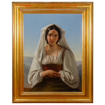 A partire dalla metà dell’Ottocento, le donne cominciarono a ricoprire un ruolo sociale più autonomo avendo finalmente un più ampio accesso al mondo del lavoro (si pensi alle aree industrializzate delle città dove si affermò il ruolo dell’operaia) e allo studio. Il tessuto sociale italiano era, comunque, in gran parte formato da contadini che lavoravano le terre e la vocazione dei territori era per lo più agricola: il nucleo familiare tipico era quello contadino dove tutti si adoperavano alla cura degli animali e alla lavorazione del raccolto. Anche l’abito contadino acquista dignità pittorica e viene realizzato in modo magistrale: soprattutto durante il Risorgimento gli abiti tradizionali si caricano di un forte messaggio patriottico e ideale come ne “La Ciociara” di Francesco Hayez realizzata nel 1842 (cfr. F. Mazzocca, Milano 1994, n. 260). L’opera presentata in catalogo, realizzata da Andrea Appiani junior, è una chiara citazione di quella del maestro veneziano, di cui infatti fu allievo: posta in una posa più “classica”, la giovane donna indossa tutti gli elementi dell’abito tradizionale ciociaro tra cui spiccano i coralli e l’ampia mantilla o tovaglia “ammantata” posta sul capo. Proprio questa pesante stoffa di cotone candido diventa pretesto per studiare l’incedere della luce sulla trama ruvida del tessuto, come una volta si faceva sulle sete indossate dalle principesse.